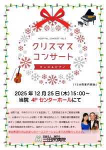 この度、三田尻病院では、入院患者様とそのご家族を対象に心温まるひとときをお届けするため、「院内クリスマスコンサート」を開催いたします。